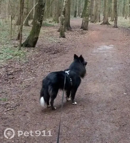 Порода - метис, 5 лет, есть схожесть с овчаркой. Основной окрас черный, на кончике хвоста есть белая кисточка, белая грудь и кончики лап. Когда напуган может поджимать уши и хвост, боится громких звуков и недоверчив к незнакомым людям. Пропал убежав в лес во время прогулки на даче.