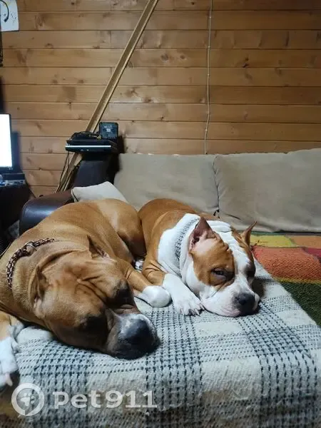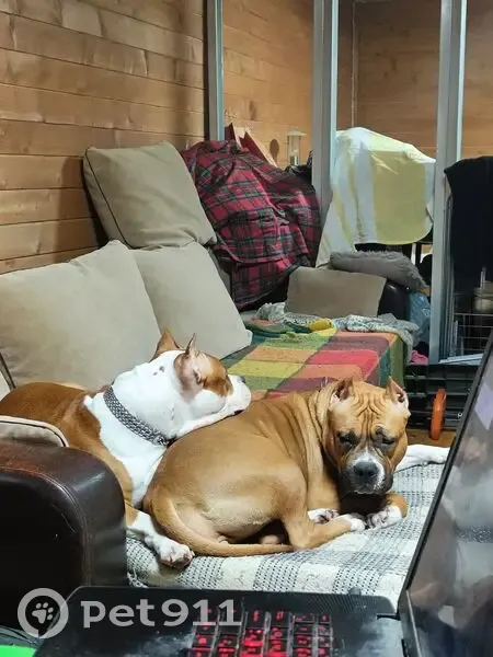 Порода американский стаффордширский терьер, возраст 1 год и 2 года, окрас рыжий с белым, уши купированы, у Муси врождённый залом хвоста, на обеих собаках ошейники в виде металлической цепочки, крупные грудастые, вес примерно 30 кг