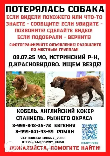 ️ВНИМАНИЕ ️ ПРОПАЛА СОБАКА АНГЛИЙСКИЙ КОКЕР СПАНИЕЛЬ, РЫЖЕГО ЦВЕТА. 8 июля в 19:25 перед грозой, выбежал из дома МО ИСТРИНСКИЙ РАЙОН, д.Красновидово и до сих пор не найден ЗОВУТ РОНИ ИЗ ПРИМЕТ- слегка заметен белый галстучек на груди, ошейник черного цвета (на фото), знает команды, откликается на имя, не кусается! УБЕДИТЕЛЬНАЯ ПРОСЬБА- ПРИДЕРЖИТЕ ЕГО, ЕСЛИ УВИДИТЕ Так же, если Вы видели собаку или обладаете какой-либо информацией, свяжитесь пожалуйста с нами по телефону, 8-999-848-35-72 ЕВГЕНИЯ 8-999-841-93-59 РОМАН очень сильно переживают дети и ждут его домой! НАШЕДШЕМУ-ВОЗНАГРАЖДЕНИЕ!