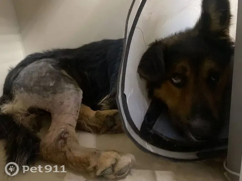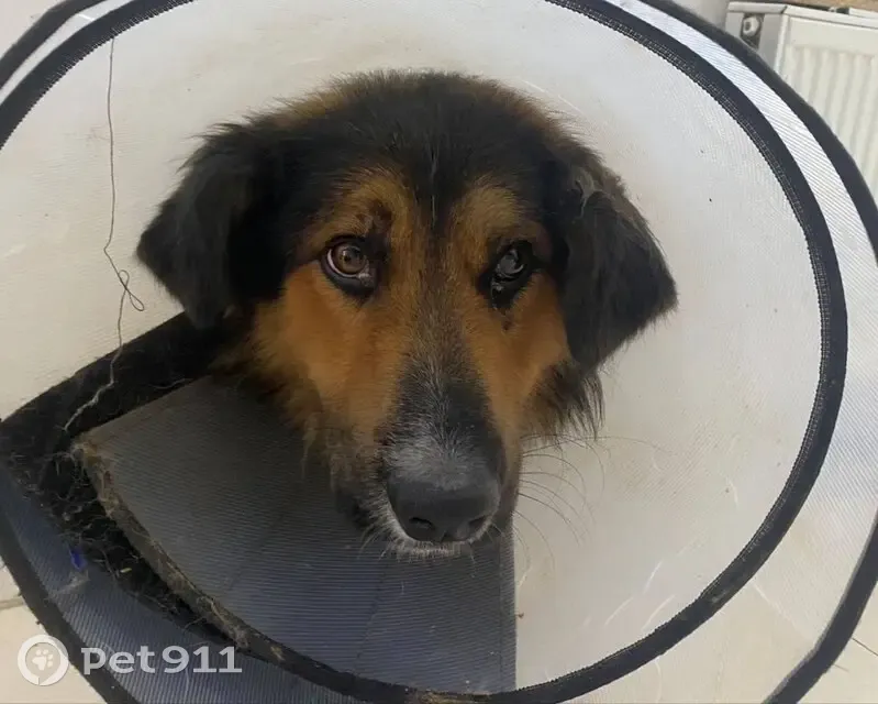Коричнево-черный окрас, ошейник черного цвета, бирка с номером телефона, задняя часть туловища побрита, след на лапе от катетера, прихрамывает