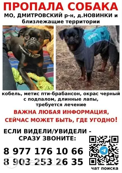 ПРОПАЛА СОБАКА! ПОИСКИ ПРОДОЛЖАЮТСЯ! 07.09.2025, МО, Дмитровский р-н, д. Новинки Пропал кобель Пти-брабансон (метис), окрас черный с подпалом, длинные лапы. Есть проблемы со здоровьем, требуется спец. Питание и лечение Сейчас может быть уже, где угодно - в любом районе Москвы и области! Собаку могли увезти на машине! Могут удерживать чужие люди. Большая просьба - перешлите информацию в чаты своих ЖК, ГСК, СНТ, коттеджных поселков, локальные группы. Поделитесь информацией с друзьми и знакомыми, может, сработает теория 6-ти рукопожатий, и собака вернётся домой Если видели/увидите, владеете любой информацией, звоните! Если идет на контакт, попробуйте придержать! +7 977 176 10 66 (ватсап, мах) +7 903 253 26 35 Чат поиска: https://t. Me/poisksticha