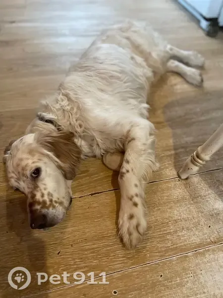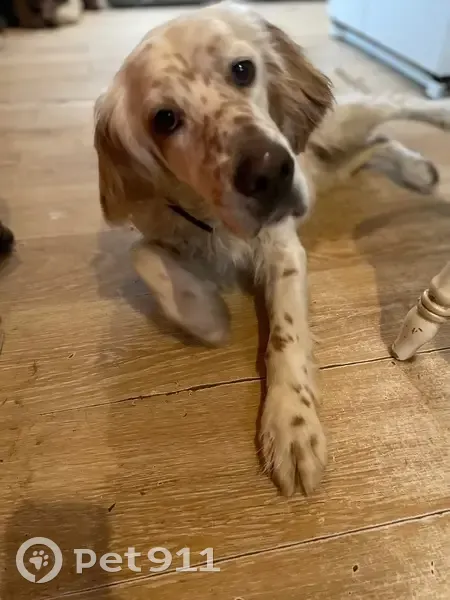 Белый сеттер с рыжими веснушками. Пропал в 12 час дня,возвращались домой с озера,повернул в луч поселка с другими моими ребятами,звола,побежала за ними.. Из леса вышли мальчишки,Гриша нет. Пошли а глубь леса-причала,он как сквозь землю провалился.. До 15 час ходила по посёлку и лесу звала (поселок в лесу),не могла выехать была перекопана дорога. В 15 час выезала,объехала все населенные пункты в районе нашего леса,в Высоково его видели через час после пропажи,ушел в лес дальше,всё дальше от дома.. К людям не подходит.. Со мной Гриня с 1 февраля,всегда гуляем бандой и он никогда не уходил(есть привязанность в стае и ко мне).Гриша был спасён с улицы. Мальчишка хороший,людям не доверяет..