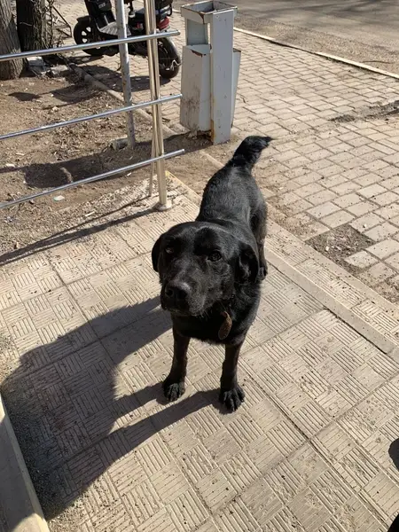 Окрас чёрный. Небольшая для лабрадора. Коричневый ошейник. Слепая.
