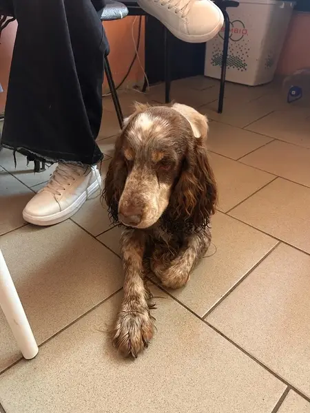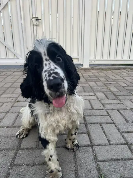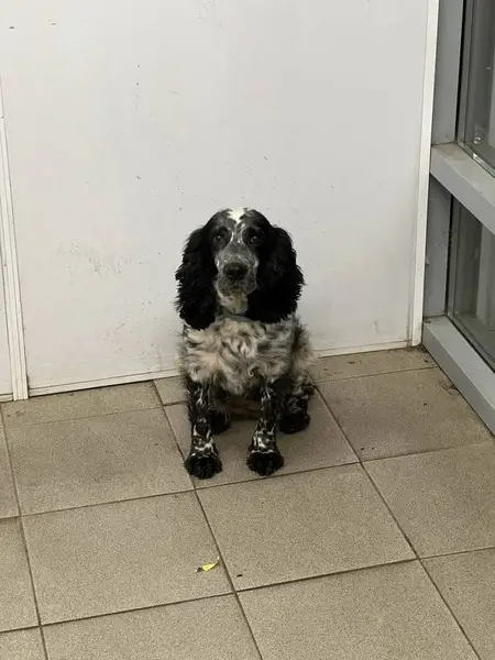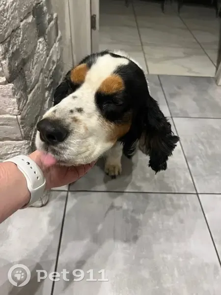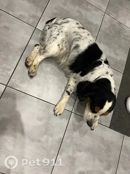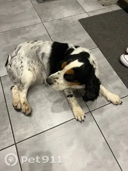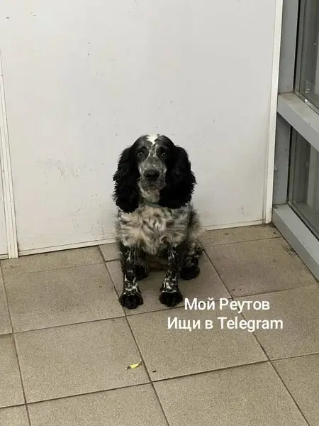Потерялась в лесу, когда ходили за грибами, в районе Еремино, Московской области, недалеко от г.Долгопрудный. Порода русский охотничий спаниель, окрас: бело- черный с коричневыми пятнами вокруг глаз, девочка, 13 лет. Характер ласковый, людей не боится.