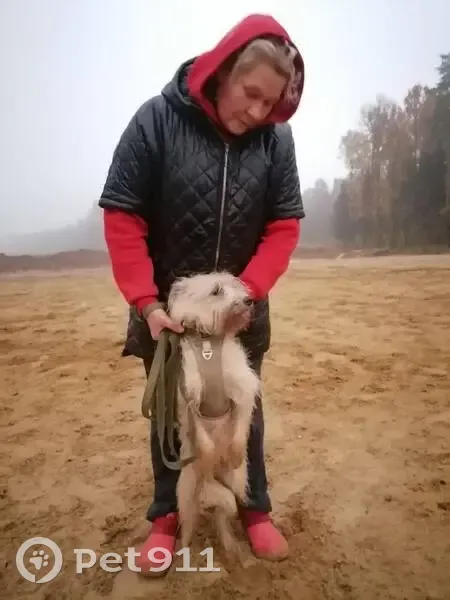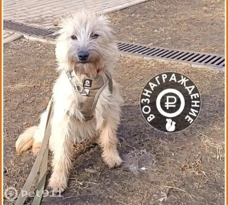 Окрас кремовый, небольшая собака по колено. Была в шлейке цвета хаки и 8-ми метровый поводок. Очень пугливая, привезена из зоны СВО, боится резких звуков и не доверяет мужчинам.
