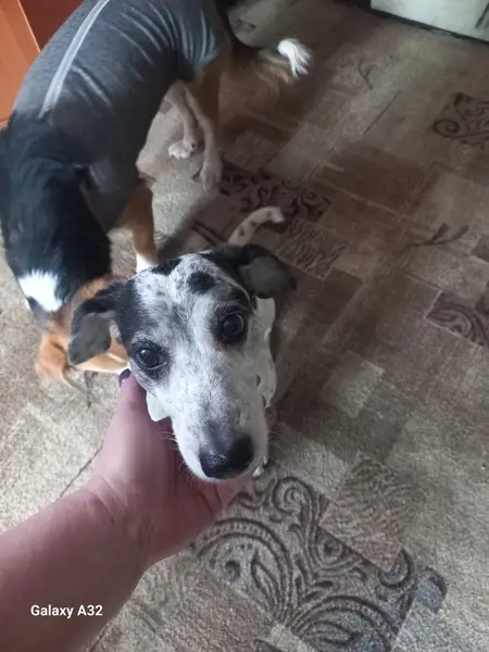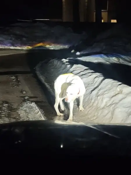 Английский пойнтер. 2 года. Окрас белый с черными пятнами. Хвост искривлен на конце. Стерилен, чипирован. Синий ошейник, вышитая бирка с телефоном. Кличка Чинар. Выскочил из ворот частного дома. Добрый, общительный, любопытный.