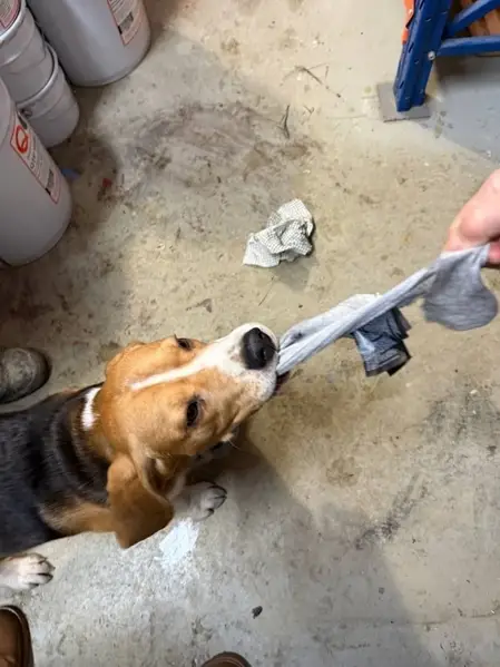 Красногорский район, рабочий поселок Нахабино. Около перекрестка дорог ведущих в СНТ Зарница и СНТ Березка, найдена собака . Сука. Бигль. Домашняя. Без ошейника.
