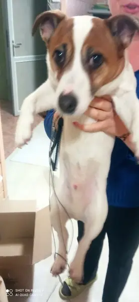 Джек рассел терьер, сука, миниатюрного телосложения, белый окрас с рыжими пятнами на ушах. Хвост купирован. Выбежала с участка во время того, как переносили вещи