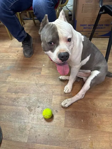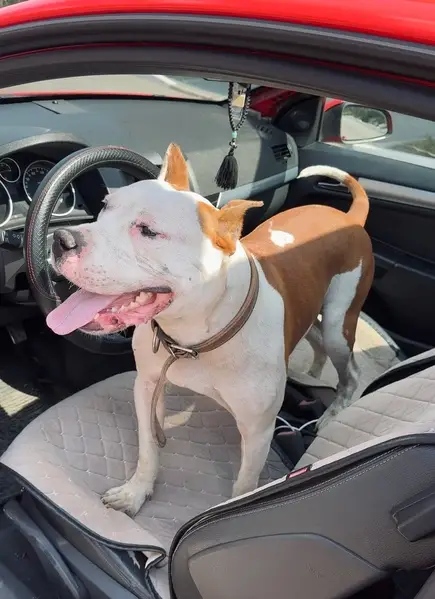 Собака выскочила из машин. Девочка, полностью белая, вокруг глаза коричневое пятно переходящее на одно ухо. Пугливая. На ней был ошейник фиолетово-зеленый.