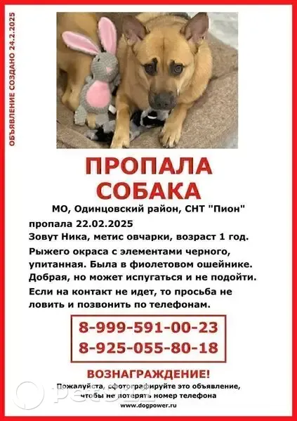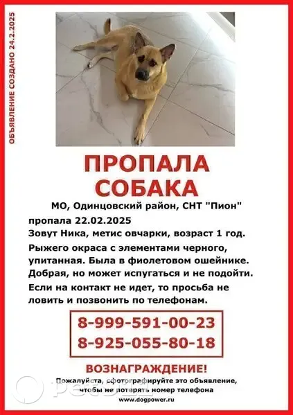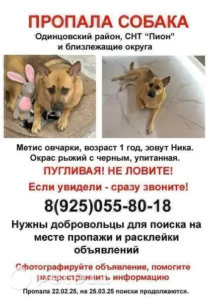 ️ Пропал(а) собака МО, Одинцовский район, СНТ «Пион», 22.02.25 Девочка Ника. Один год. Рыжего окраса с элементами черного ( мордочка, по спинке) . На момент потери была упитанная. Метис овчарки. Пугливая, но может подойти к собачкам. ️ 8 (999) 591-00-23 Иван @ivanSVladimi 8 (925) 055-80-18 Татьяна @lyubov_vokrug_nas ️ 8 (926) 022-02-06 Ирина @radkovskaya_lash Чат поиска: https://t. Me/+UOH8G8JFN40xODVi Координаты пропажи 55.746618, 36.990036