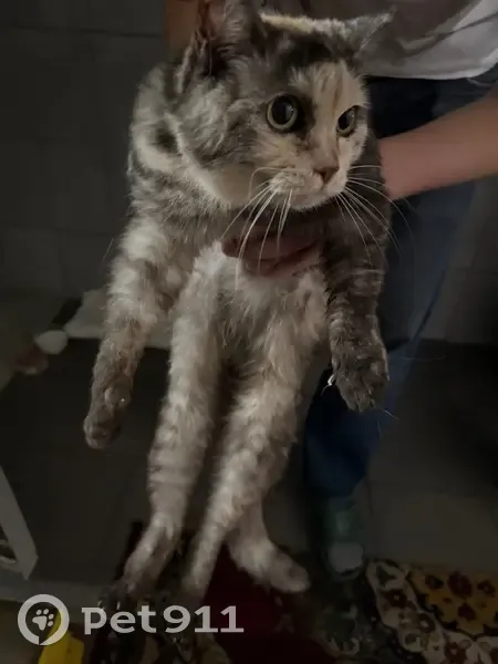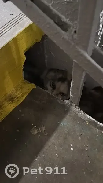 приходили к знакомым и по пути в квартиру парень увидел ее забившуюся в угол;( не похожа на уличную, чистая, лапы тоже чистые, довольно тактильная, но боится звуков, по типу входной двери, как кто-то заходил в подъезд- забивалась вновь.