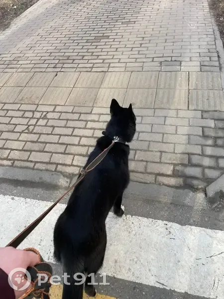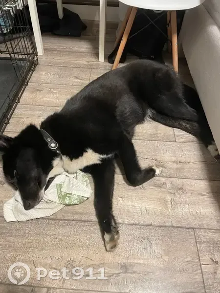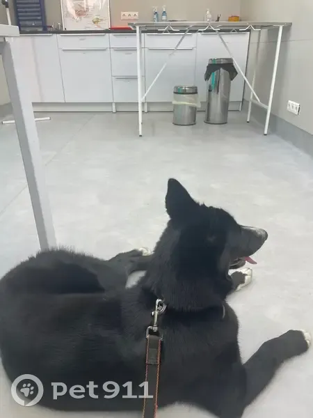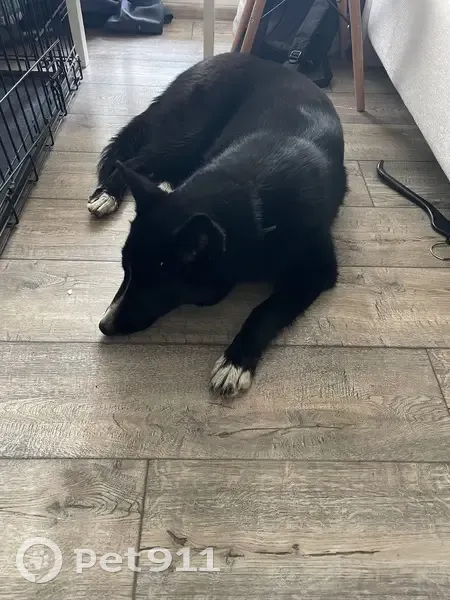 Окрас черный с белой грудкой, с белой полоской на носу и белыми носочками на лапах. Порода: метис лайки или лайка Без чипа, с ошейником и половинкой адресника (без телефона). Молодая (нет года), послушная, игривая, добрая, контактная. Предположительный маршрут собаки: Зименки, Филимоновское шоссе, град Московский, первый Московский город парк
