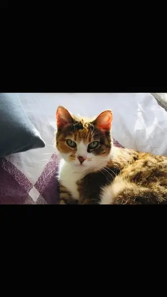 Явно домашняя кошка, появилась у дома 38 по ул Менжинского, идёт на руки, немного воспалены глазки, сопит и похрюкивает, но больше мяучет, очень хочет домой