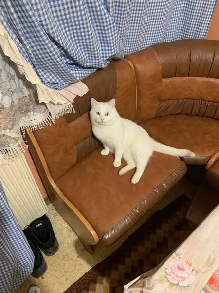 Найден взрослый белый кот в районе Ховрино!!! Кончики ушей немного обрезаны! На хвосте и голове еле заметные серые полосы.