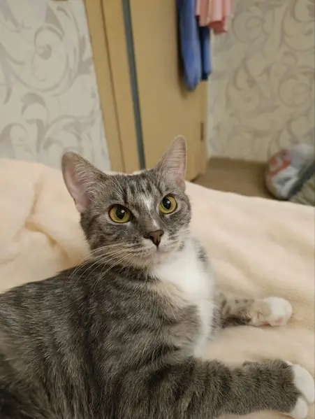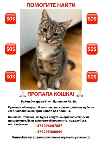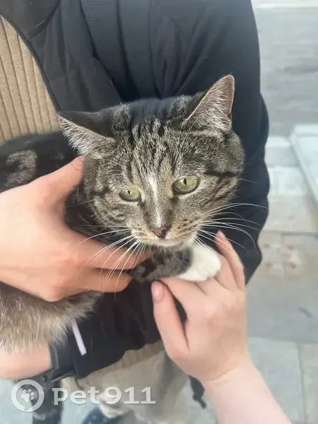 Полосатая серая кошка (кот?) с белым фартучком Явно домашняя, очень ласковая, когти подстрижены Нашлась у Водоотводного канала, напротив офиса на Озерковская наб., 14, стр. 1, Москва