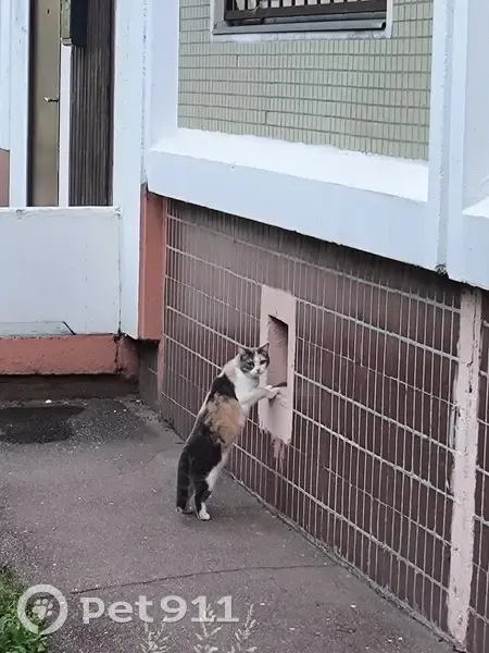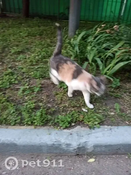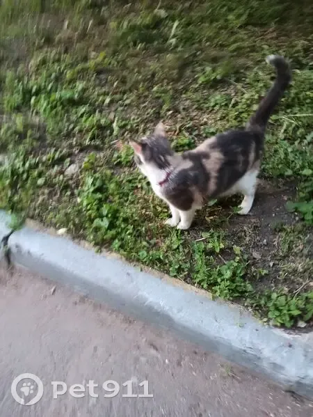 Трехцветная, в крупные пятна. Есть малиновый ошейник. Даёт себя гладить, явно домашняя, но напуганная