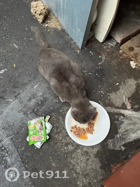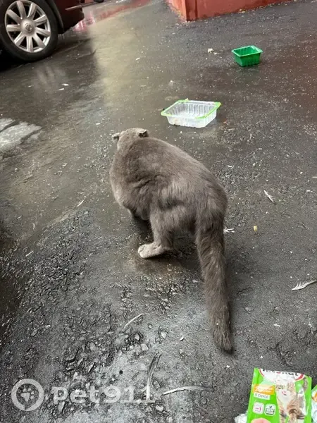 Похож на британца или шотландца, серый с желтыми глазками. Хромает на заднюю правую лапку, как будто бы был след от ошейника. Очень голодный, съел 3 пачки корма, дает гладится, мяучит
