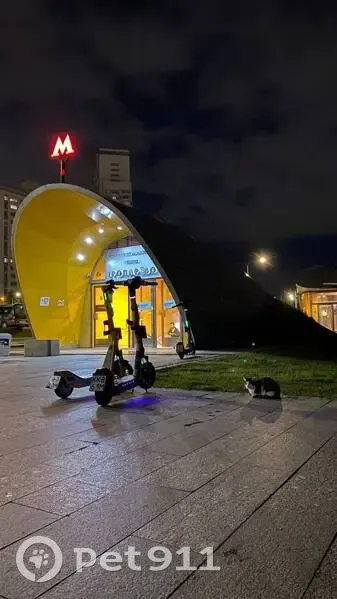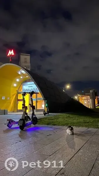 Кот (или кошка) сидели рядом с входом номер 7 у метро Тропарево, первое время шёл на контакт, видно, что домашний, потом начал бояться побаиваться, этого кота видим впервые в этом месте Окрас: белый с темно-коричневыми/серыми пятнами, некрупный