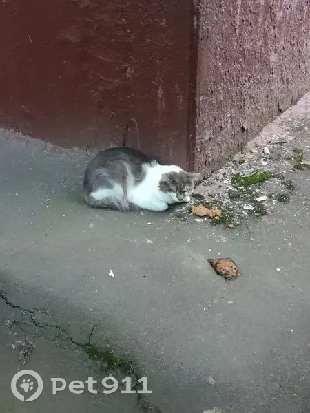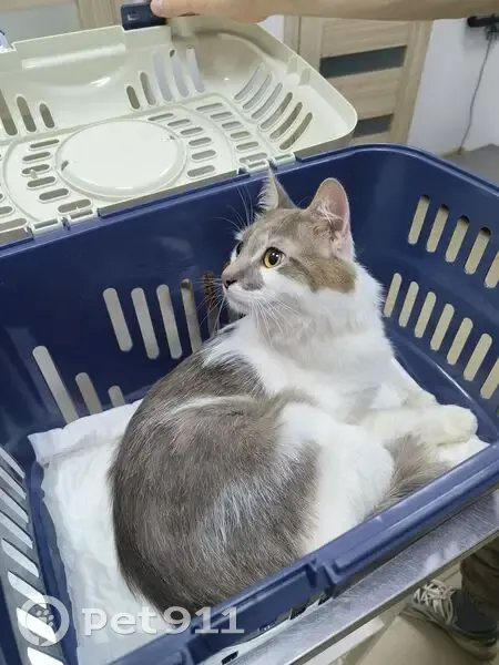 Бело-серый котик с небольшими рыжими пятнышками. Ветеринар сказал, что котик был подстрижен, но уже оброс.