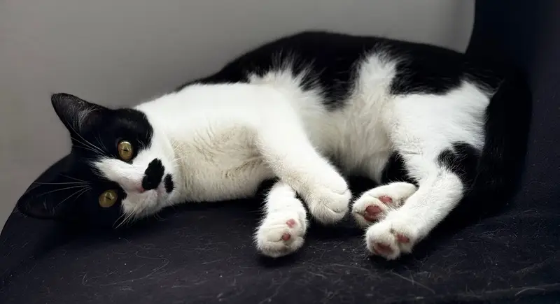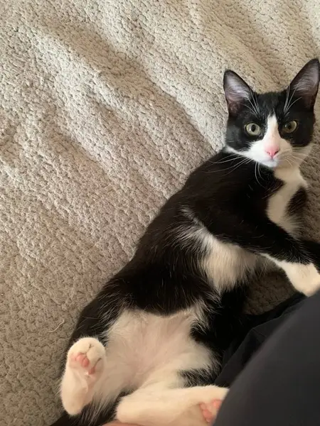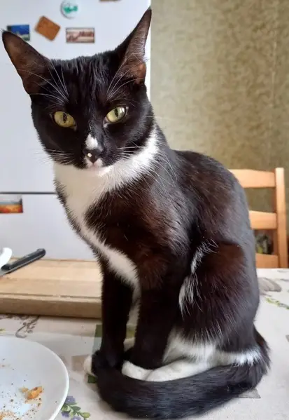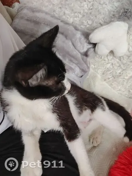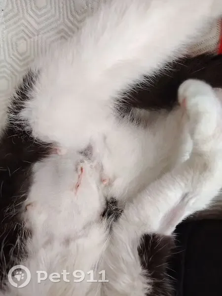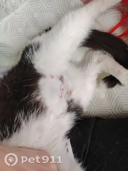 Чёрно-белая молоденькая кошечка, к людям очень дружелюбная, к другим животным агрессивна. На лапе выбрито, на пузе относительно свежий шов, отек и синяк, вероятно, недавно была операция.