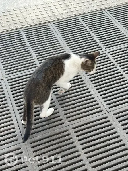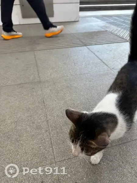 Кошечка белая с коричневым (или кот, но скорее кошка). Шла по подземному переходу и громко мяукала. Подошла, дала себя погладить и взять на руки, но потом вырвалась и убежала на стройку рядом с выходом 6 метро Савеловская