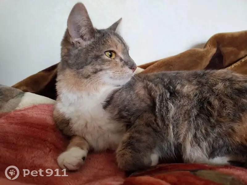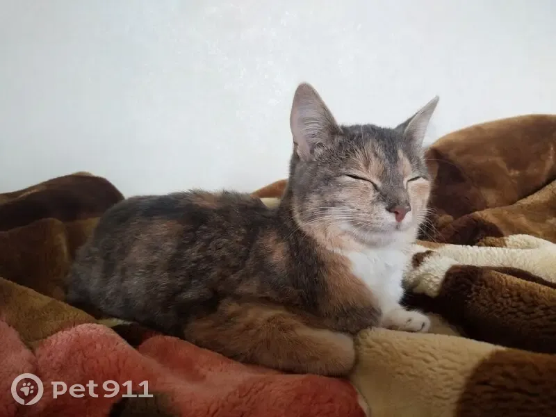Трёхцветная кошка, миниатюрная и худенькая, явно домашняя. Была с ошейником розового цвета с серебряными стразами, на котором ручкой написан номер телефона. Телефон не действителен.