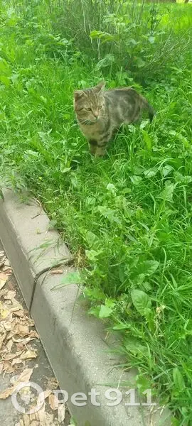 Котик с рыжими глазами, тигровым окрасом и в голубом ошейнике.