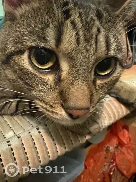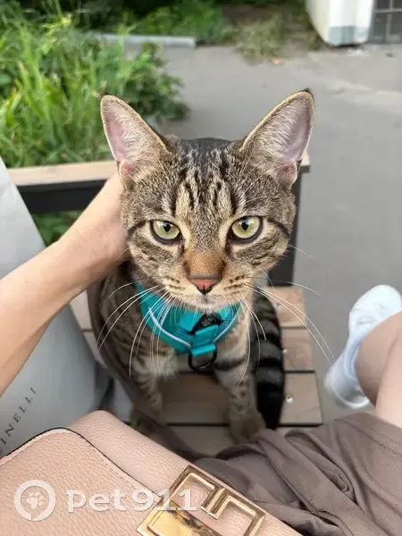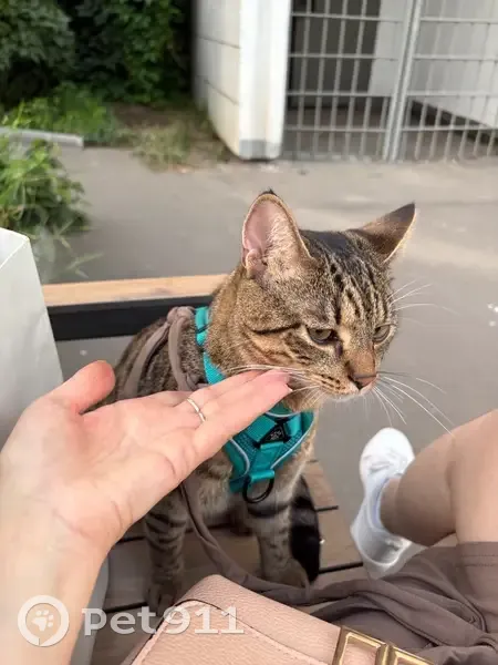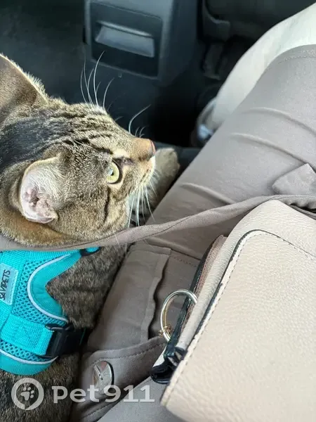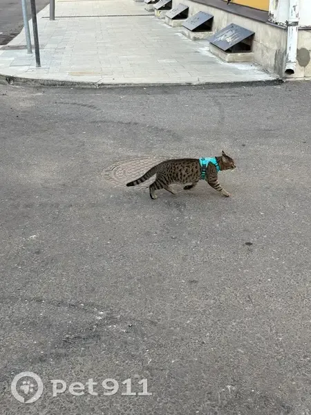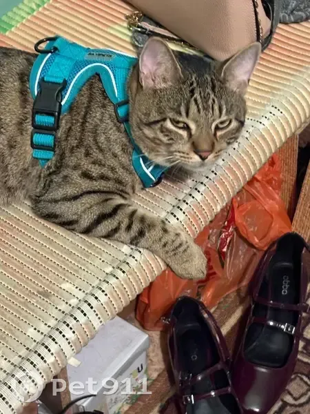 Найден кот с ошейником-шлейкой бирюзового цвета, молодой, серый с полосками, тигровый, домашний, идет на руки ко всем, ласковый, приученный к ошейнику для прогулок