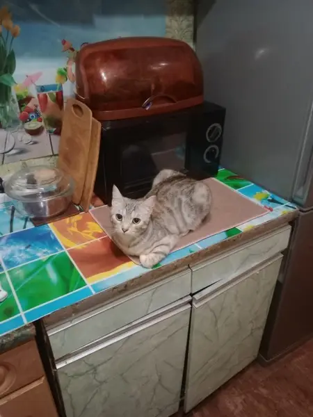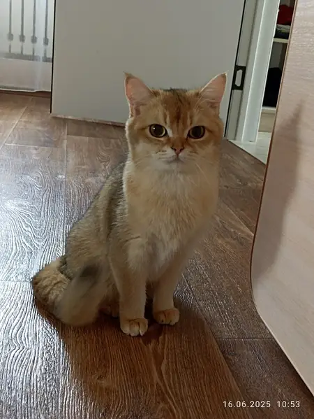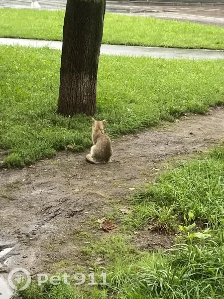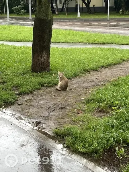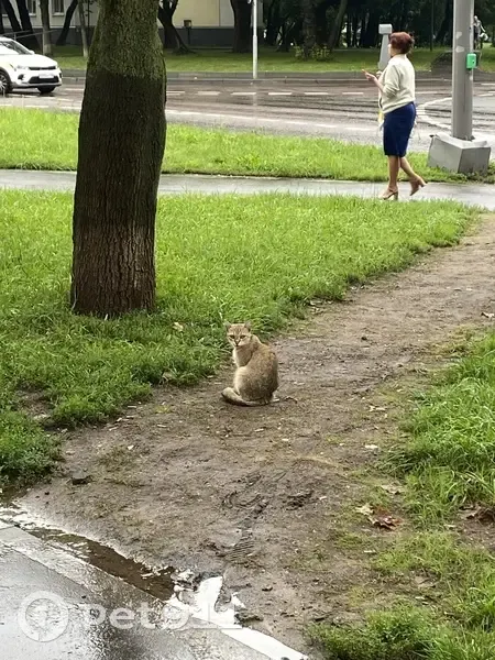 Замечен кошка. По повадкам домашняя. Грустная, мяучит, смотрит в глаза. Напугана, далеко от дома не отходит. Впервые была замечена 31.07.