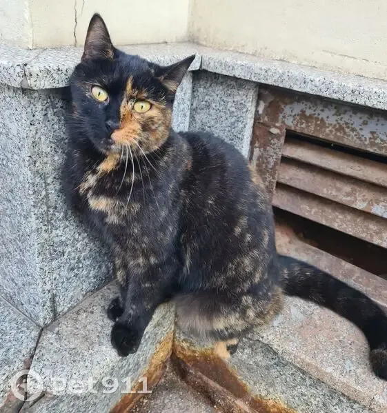 Ласковая, не пугливая. Сидит возле вентиляционной решетки подвала. Туда и прячется.