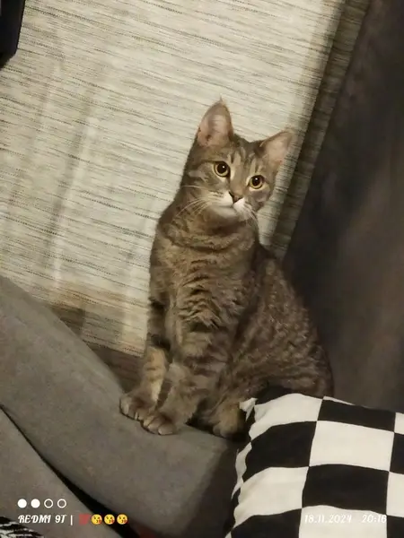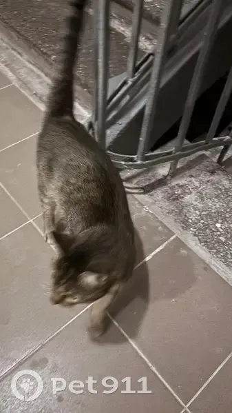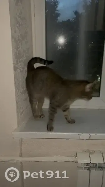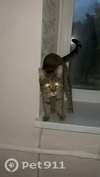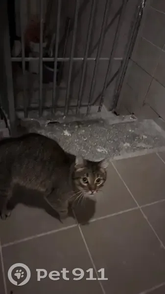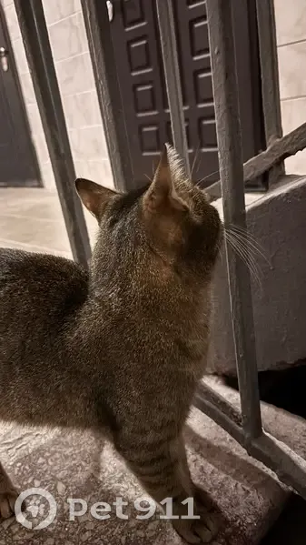 Найден кот! На вид домашний, глаза зеленые, разговорчивый, осторожничает с незнакомыми, но если с ним заговорить, то подходит и дается гладить. Шерстка в полоску, блестящая. Кот молодой