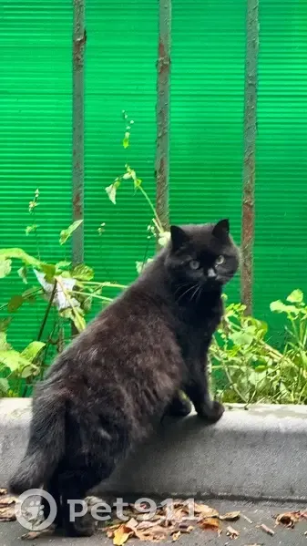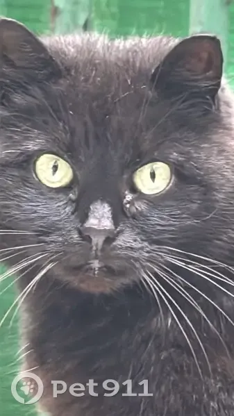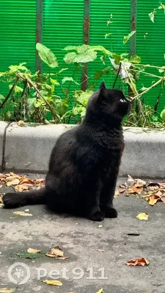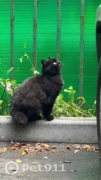 Черный пушистый кот/кошка. Хвост кажется немного укороченый,цвет шерсти отливает коричневым,глаза желтые. Боится людей ,но упитанный. Тут около недели /две.