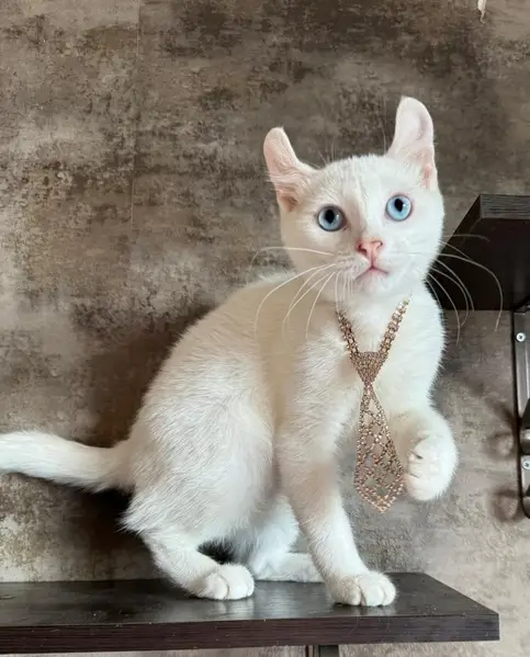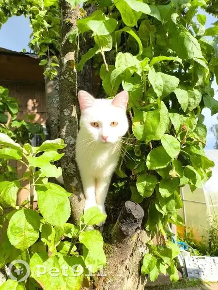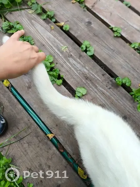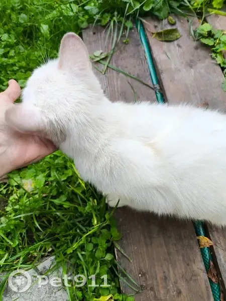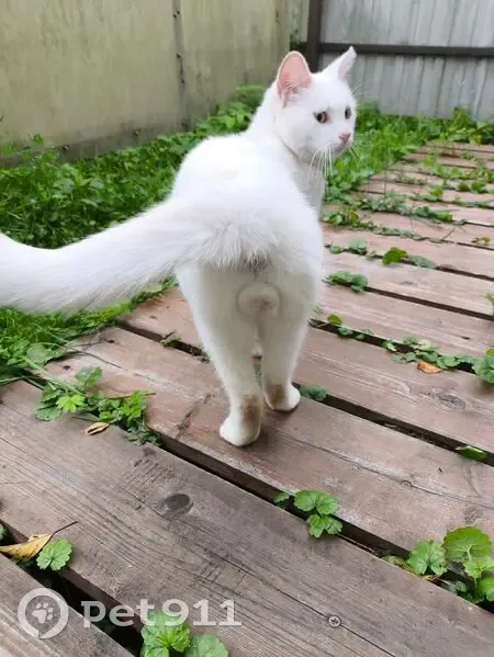 Белый кот с молочным оттенком., Желтые глаза. Очень ласковый. Особых примет не заметили, разве что шерстка в некоторых местах чуть желтоватыми разводами отливается - на лопатках, прям впадинка желтоватая и на хвостике лёгкие разводы-полоски. И очень добротное "хозяйство", извините, но каждая деталь может быть важна.