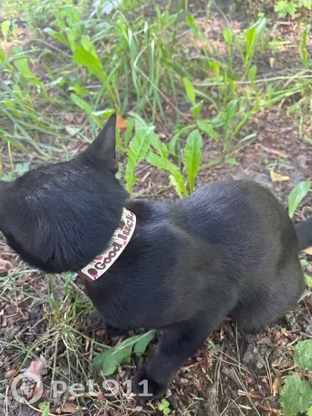 Замечен чёрный котёнок в ошейнике с надписью “good luck” в сквере ул. Лётчика Бабушкина / ул. Верхоянская. Может быть его кто-то ищет?! Ошейник не тугой, сидит свободно. Не стала его снимать, т. К. Это примета, если вдруг его ищут Забрать не могу есть своя собака которая не любит кошек