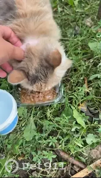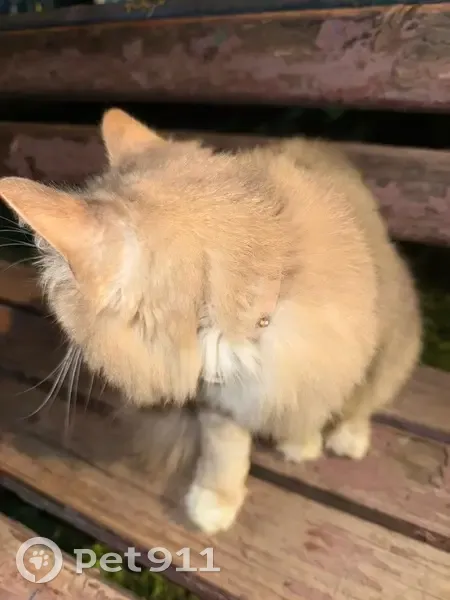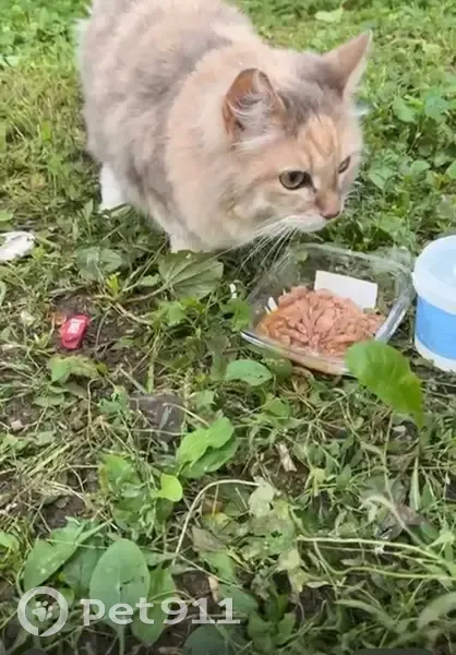 Кошка бежевая с пятнами серыми и белыми, с розовым ошейником, очень контактная, шерсть длинная, уже давно ее заметили жители, не самовыгул.