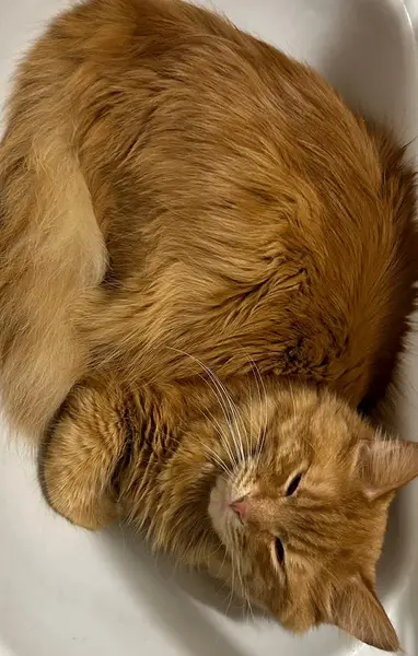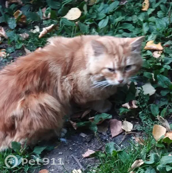 Рыжий кот (кошка). Красный ошейник с металлическим украшением (бубенчик или колокольчик). По виду домашний, ухоженный. Но пугливый.