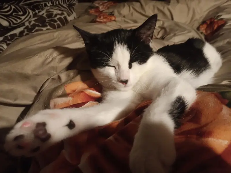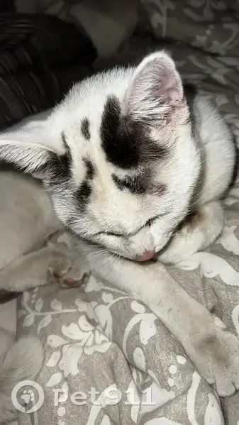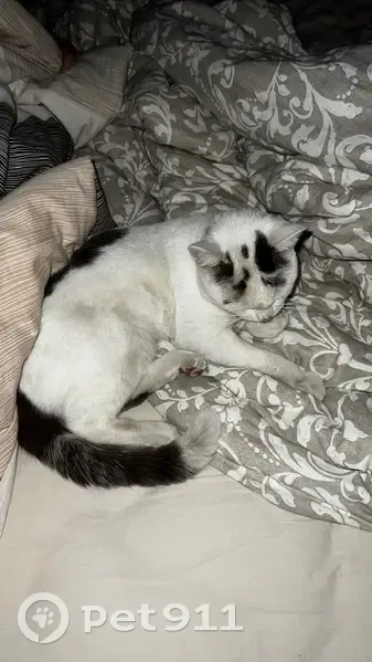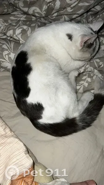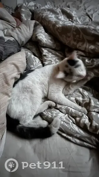 Маленький белый кот с темными отметинами, сидел в подъезде и забежал в квартиру, где тут же устроился на кровати и начал мурчать. Ласковый и очень ручной