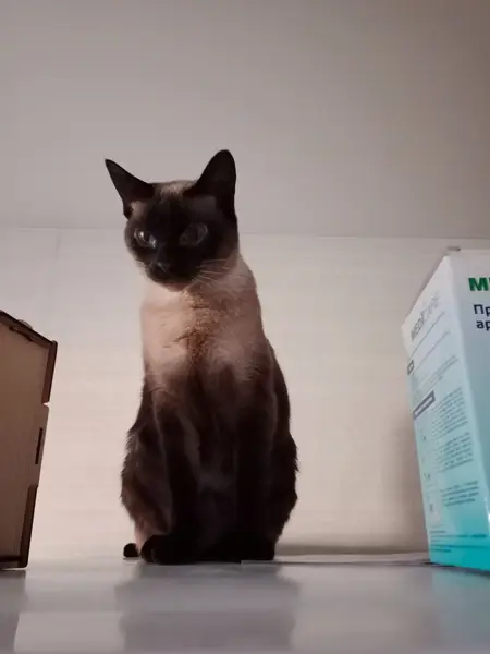 Найдена кошечка, небольшая, окрас похож на сиамку, шесть не длинная. В домашнем ошейнике. На мордочке белое пятно, на лампках белые носочки