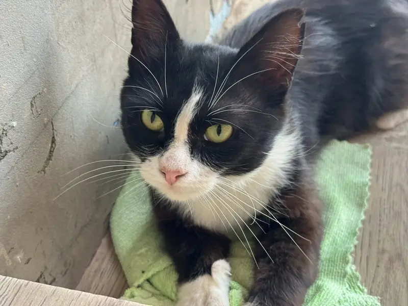 Окрас черно-белый, кот или кошка подросток. Собак не боится, как и людей. К лотку приучен. Найдена рядом со спортивной коробкой. Мяукала, шла к людям. Примерно по адресу Вострухино д 5 или д7.
