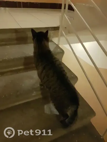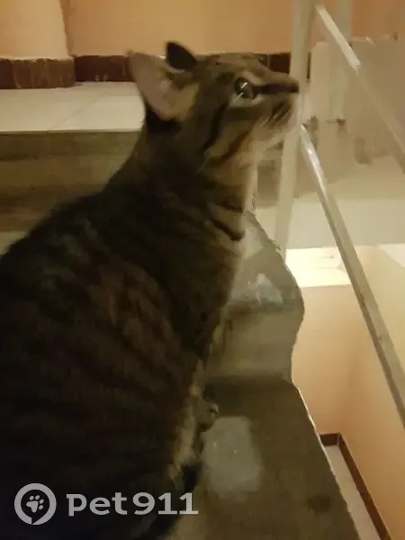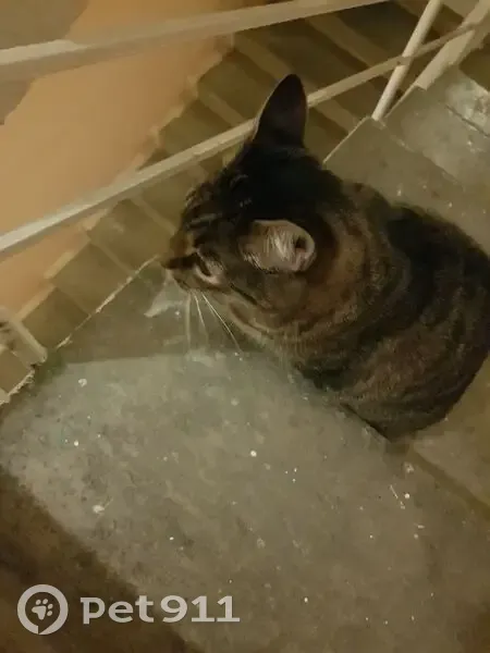 Здравствуйте. 06.11.2025 в г. Москва, по адресу Генерала Белова, д. 43, корп. 5 в подъезде №2 найден кот (фотографии прилагаю). Кот упитанный, стерилизованный. На первой фотографии глаза светятся от вспышки. Глаза у него обычные (карие), на других фотографиях видно. Цвет питомца серо-коричневый с чёрными полосками. Животное явно домашнее. Потому что спокойно идёт на контакт. Видимо - уже взрослый кот, лет 10, может немного меньше. Для обратной связи можете писать на телеграмм @avkhakhalin (Андрей)