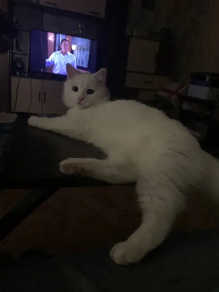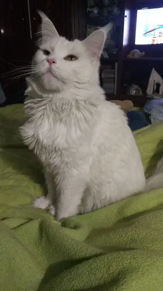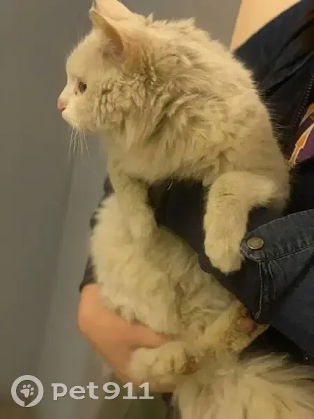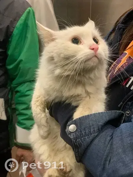Найден котик, белый пушистый, чипа нет, лет 5 +/- вроде по зубкам сказал ветеринар. Очень ласковый, к людям идёт, мурчит, трётся об ноги и спокойно на руки идёт.