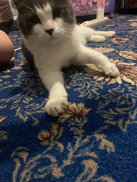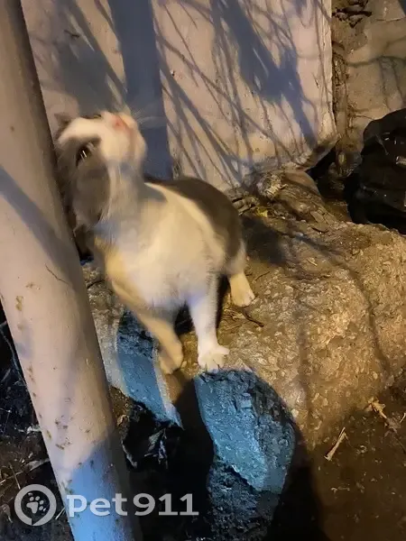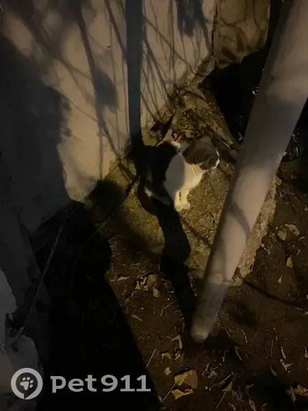 Ручная, гладиться, идет на руки, разговаривает, тянет лапки, чтобы продолжали гладить. Серая с белым. Не крупная. Молодая, но далеко не котёнок. Слегка в пыли и земле. Кажется домашней, но убежавшей. Ошейника нет.