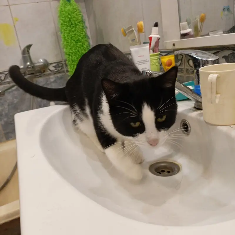 Черно-белый, зелёные глаза, взрослая, по поведению домашняя, к лотку приучена, спокойная, ласковая. Сидела под машиной, плакала, дочь позвала-она пошла.