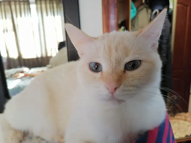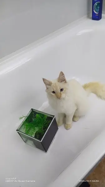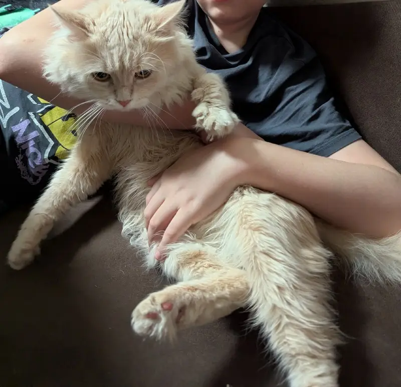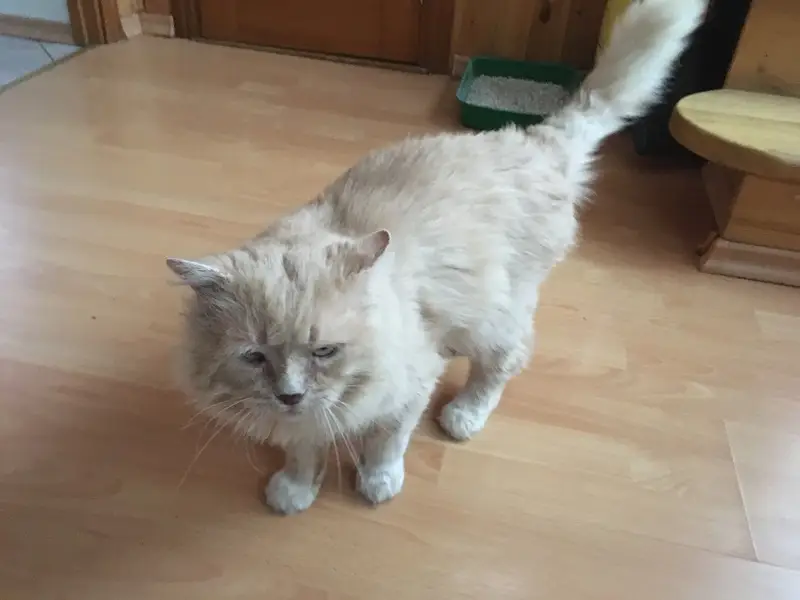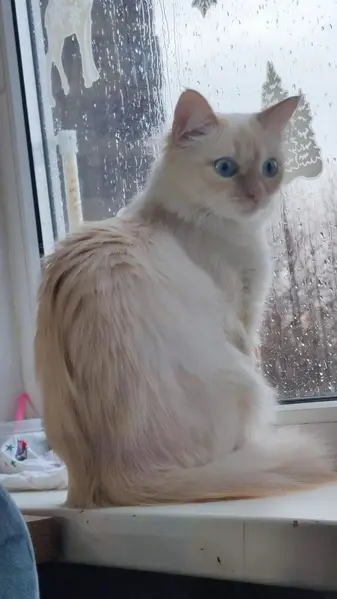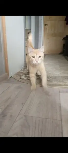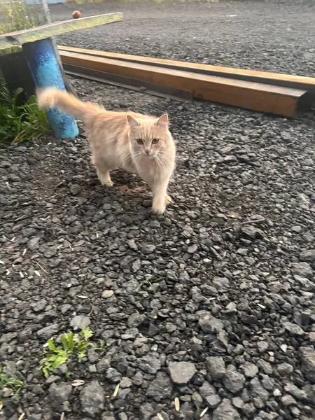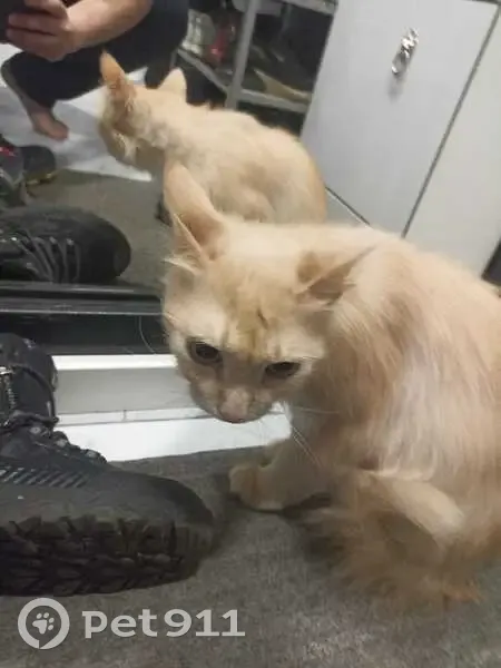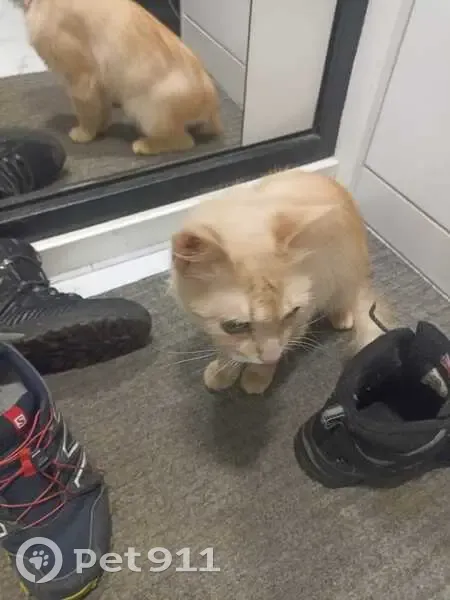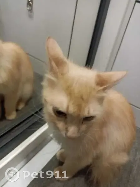 Рыже белая окрас , сидит у подъезда под деревом.Молодая молодой кот кошка . Около 1 годика . Худая.