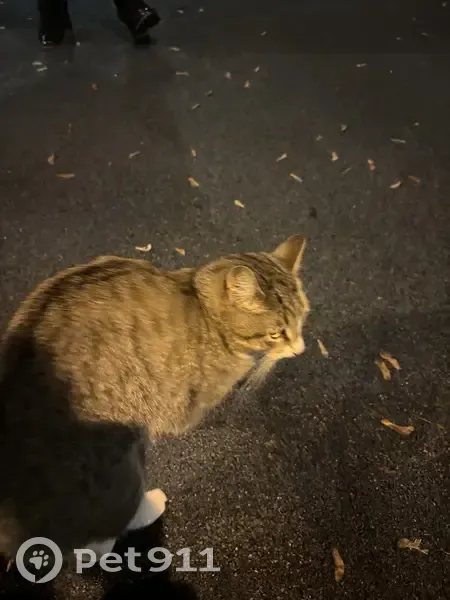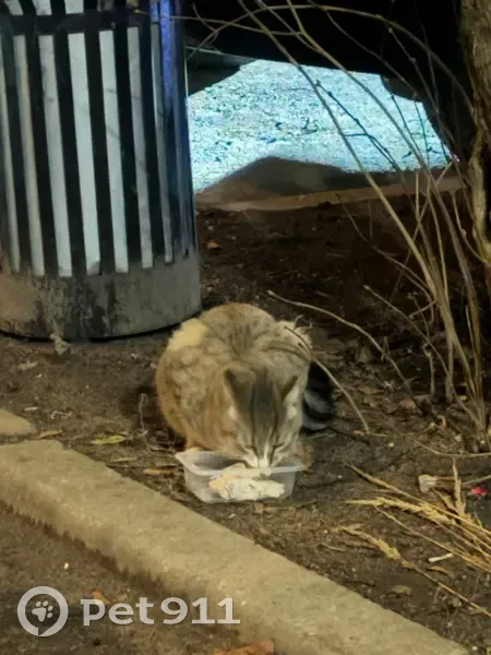 На носике белая полоска, сам разноцветный. Очень дружелюбный котик, но пугливый, ест с опаской. Кто-то потерял? Или на самовыгуле? К себе взять не смогли (аллергия), но регулярно видим его во дворе