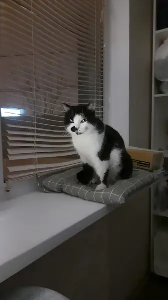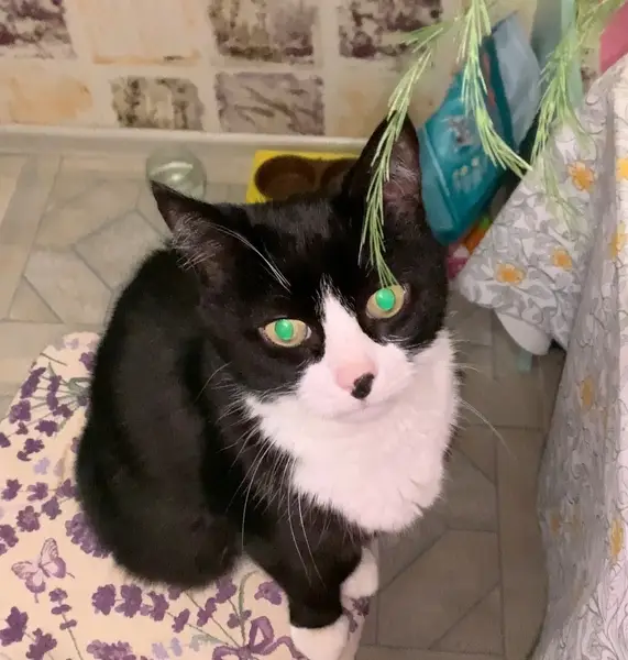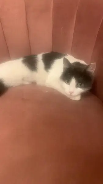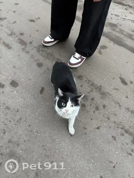 Нашла котика, мальчик, очень ласковый, не кастрирован, шерсть белый с серными пятнами, немного грязная, глаза зеленые, часто гуляет около домов Дегунинская 13к1 и 13к2