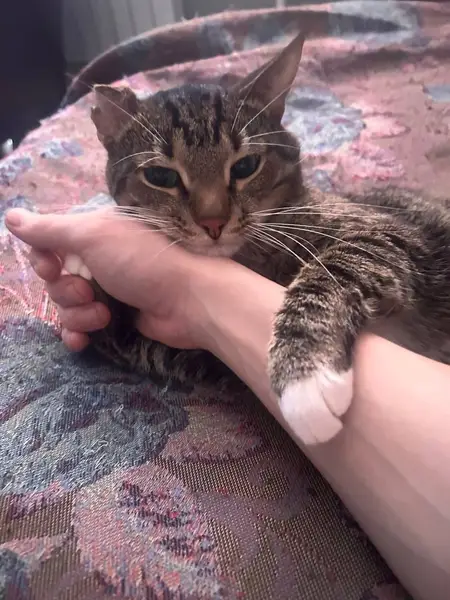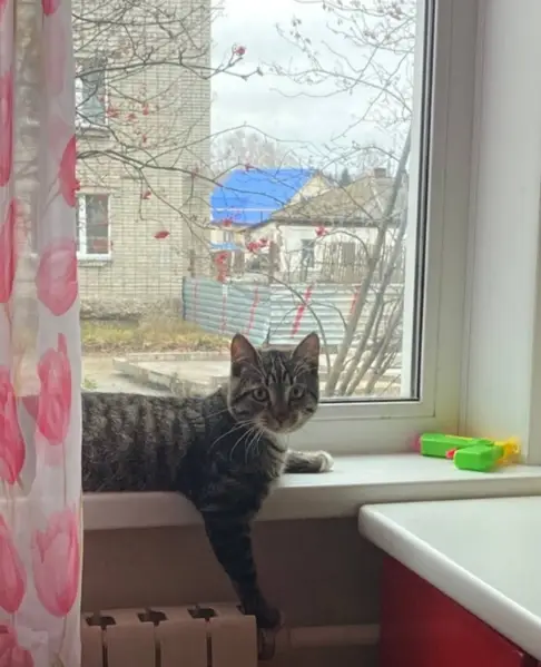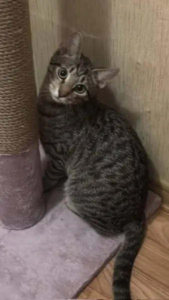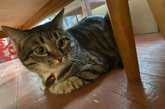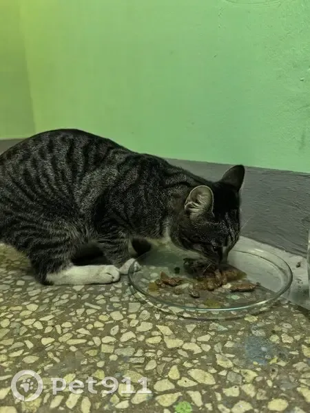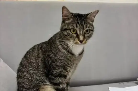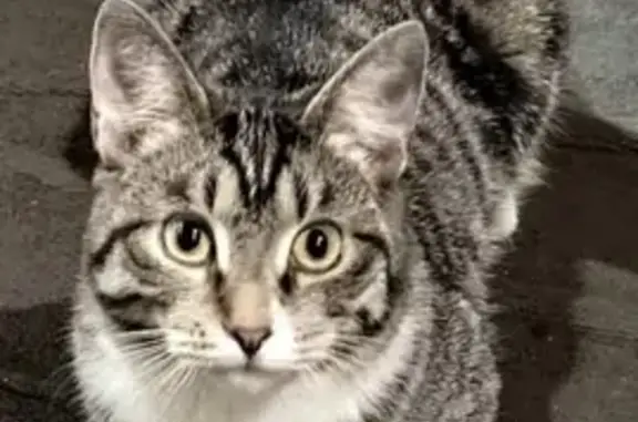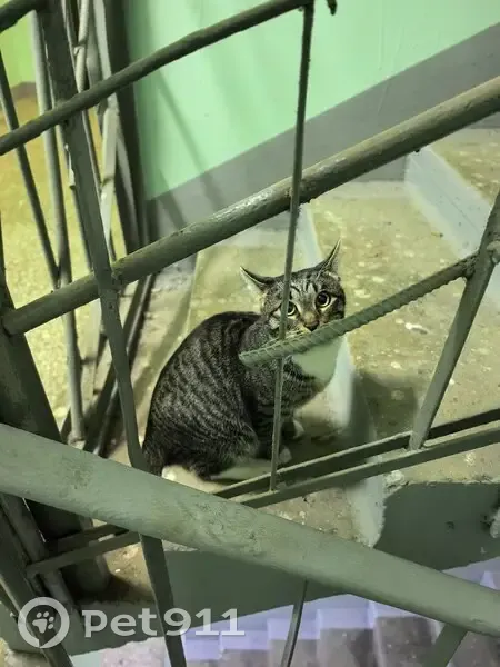 В подъезде найден кот 4.12.2025, в домовом чате пишут, около двух недель кот находился около дома Серый окрас с белой грудкой, задние лапки белые, мальчик, по виду домашний, возраст год-два, очень добрый к людям.