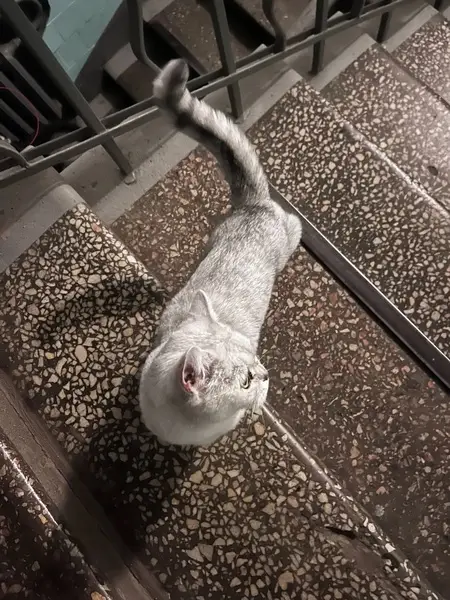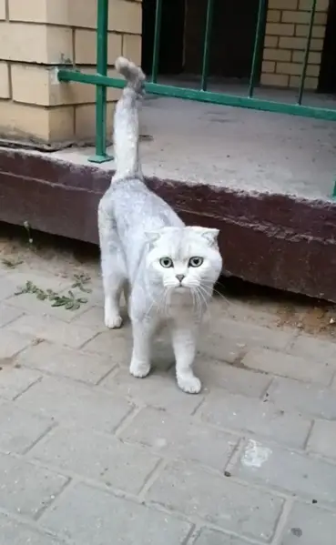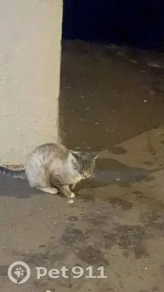 Первый раз кота заметили примерно пару месяцев назад. Очень нежный и контактный. Мурлыкает и подбегает, если позвать. Возможно, бывший домашний. Похож на породистого -- бенгал+сиамец.