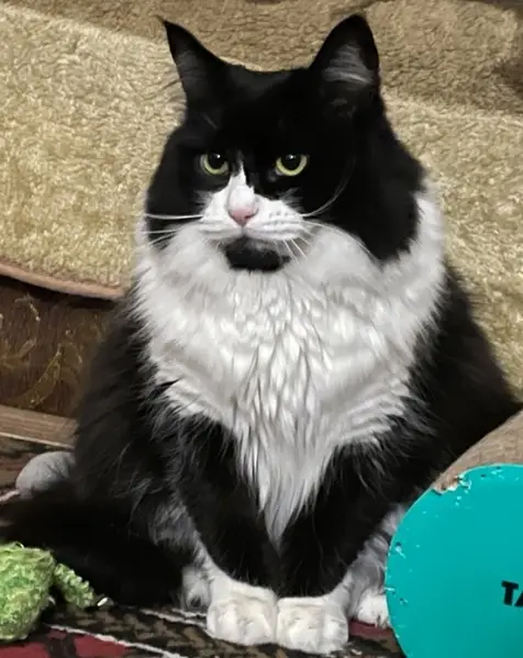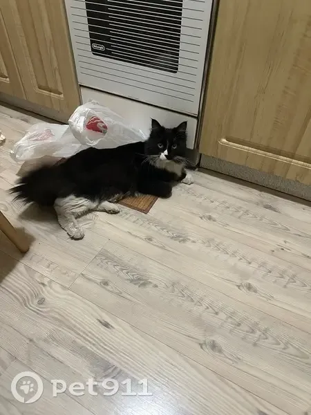 Черно-белый кот, пушистый хвост, белые лапки и грудка. Явно домашний. Ходит в лоток. Любит лежать на животе.