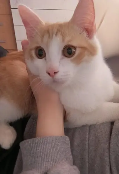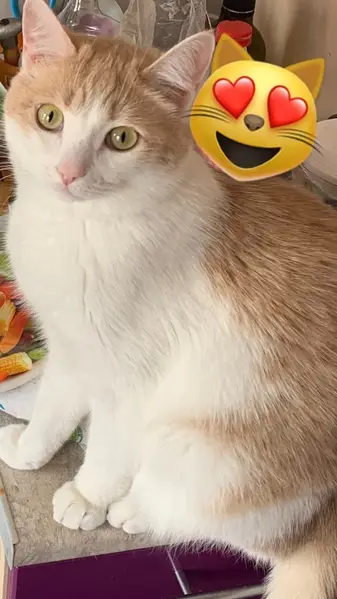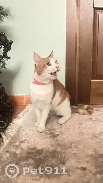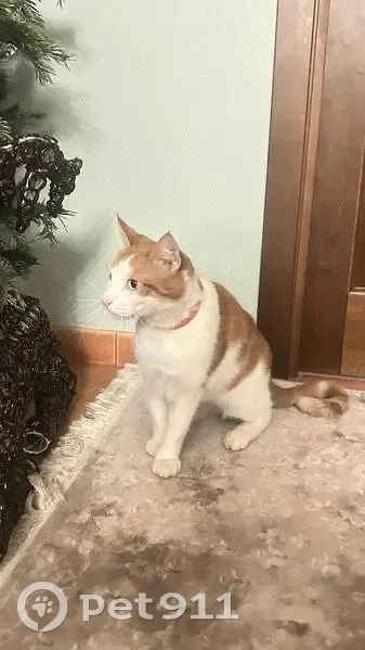 Рыже-белый окрас, розовый резиновый ошейник. Кот был на улице, громко мяукал. Шерсть ухоженная, очень ласковый